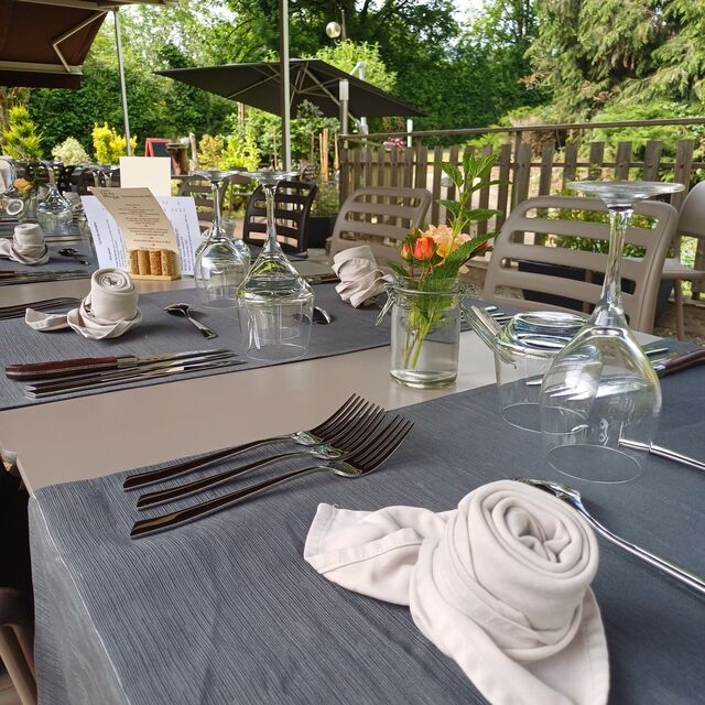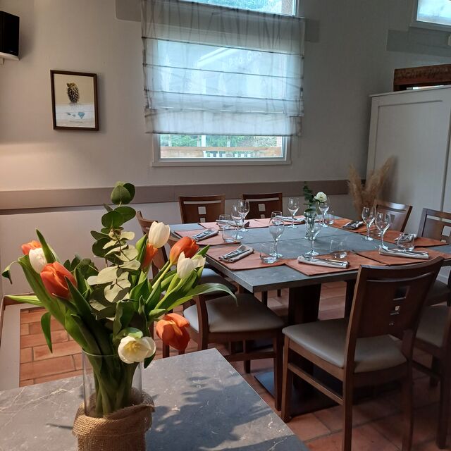 Evadez-vous le temps d'un déjeuner de travail, prenez le temps de partager un déjeuner, un dîner entre amis, en famille... Aux beaux jours, la grande terrasse fleurie et ombragée vous permettra de profiter de l'extérieur et du calme des lieux. La salle, cosy et chaleureuse, vous accueille en toute intimité.